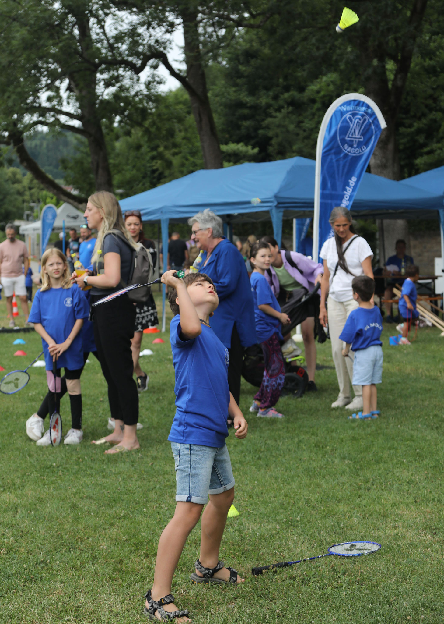 Jetzt zeigte sich Organisator Gerd Hufschmidt vor allem froh darüber, „dass wir keine 35 Grad haben“. So habe man sich zwar früher über den Sommer gefreut, aber „heute sind die Wolken mein Freund“, bekannte er. Positiv war in seinen Augen ebenso der Umstand, dass sich neun Abteilungen an der großen gemeinschaftlichen Veranstaltung beteiligten, und dass bei dieser Gelegenheit auch viele ehrenamtlich engagierte Jugendliche an den Stationen präsent waren – und „sogar selbst Verantwortung übernahmen“. Begeistert war Gerd Hufschmidt außerdem von der schönen und friedlichen Atmosphäre im grünen Kleb, und er sprach von einem echten „Familien-Happening.